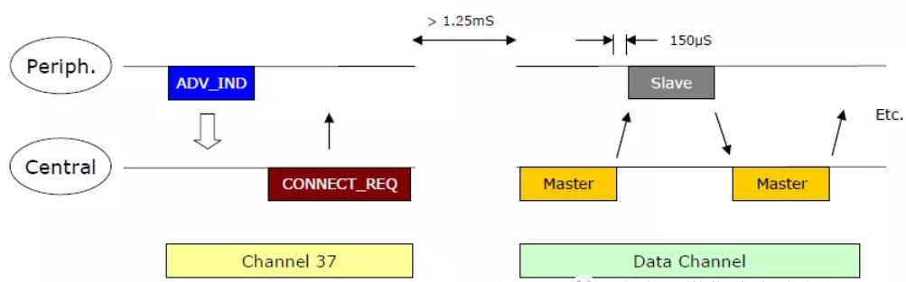 低功耗藍(lán)牙芯片特有的設(shè)計(jì),也是其快速建立連接的基礎(chǔ)。低功耗藍(lán)牙設(shè)備之間建立連接的過程如下: