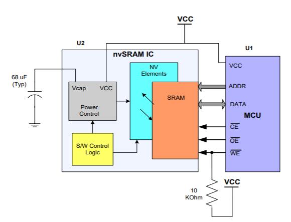 高速SRAM單元提供了非常高速的讀寫訪問(wèn),并且可以像標(biāo)準(zhǔn)SRAM中一樣無(wú)限次地寫入或讀取NV-SRAM。如果斷電則利用存儲(chǔ)在與NV-SRAM的VCAP引腳相連的小電容器中的電荷將SRAM中保存的數(shù)據(jù)傳輸?shù)脚c每個(gè)SRAM單元集成的非易失性元件。 NV-SRAM VCAP引腳上需要的電容器只有幾十µF,典型值為68 µF(有關(guān)VCAP的允許范圍,并在上電期間通過(guò)內(nèi)部充電電路進(jìn)行充電。 VCAP上存儲(chǔ)的電荷足以在掉電期間將SRAM數(shù)據(jù)復(fù)制到非易失性元件(稱為存儲(chǔ)操作)。