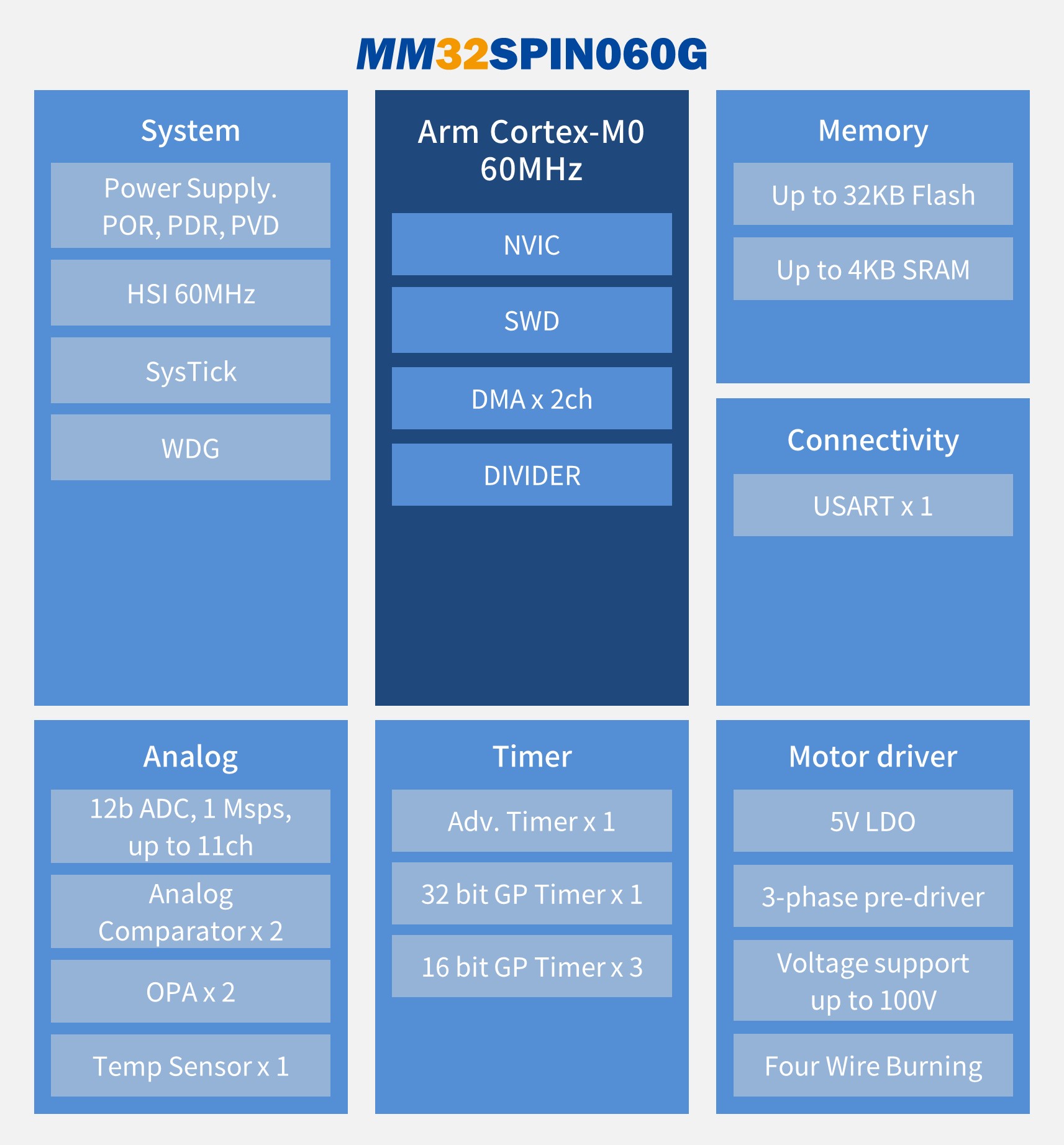 MM32SPIN060G存儲及運算資源:32KB Flash,4KB SRAM,最高主頻60MHz,7個定時器資源:1個16位高級定時器、1個32位通用定時器、3個基本定時器、1個12位IWDG、1個24位Systick,支持2通道DMA,硬件除法器HW-Div,1路12位模數(shù)轉(zhuǎn)換器ADC,支持7通道,采樣速率1Msps,2路模擬比較器COMP、2路軌對軌運算放大器OPAMP,三相N溝道柵極驅(qū)動器,支持UART/SPI通信,內(nèi)部LDO支持工作范圍5.5~18V,預驅(qū)工作電壓高達100V,支持四線燒錄功能,工作環(huán)境溫度-40℃~105℃,提供QFN32封裝。適用于多種應用場合,包括服務器風機、泵類、風機類、PWM通信控制電機應用等。更多詳情請洽官方代理英尚微。