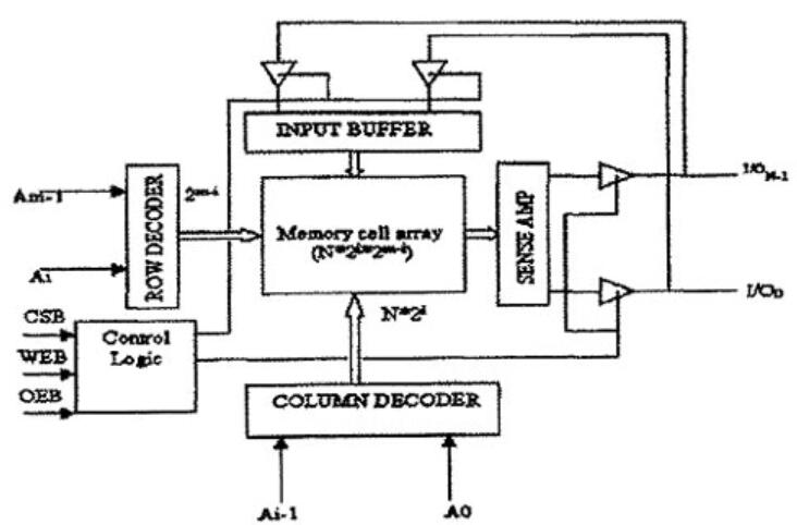 由上圖看出SRAM一般由五大部分組成,即存儲單元陣列、地址譯碼器(包括行譯碼器和列譯碼器)、靈敏放火器、控制電路和緩沖/驅(qū)動(dòng)電路。在圖中A0-Am-1為地址輸入端,CSB. WEB和OEB為控制端,控制讀寫操作,為低電平有效1100-11ON-1為數(shù)據(jù)輸入輸出端。存儲陣列中的每個(gè)存儲單元都與其它單元在行和列上共享電學(xué)連接,其中水平方向的連線稱為“字線”,而垂直方向的數(shù)據(jù)流入和流出存儲單元的連線稱為“位線”。