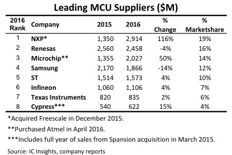 收購飛思卡爾前,NXP在2015年的排名僅為全球第6,而飛思卡爾當(dāng)時已是全球第二大微控制器供應(yīng)商。